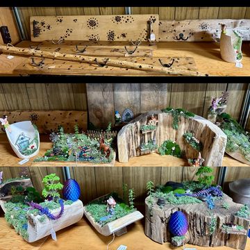 Wood scenes, walking sticks, bath tub trays, coat & key racks